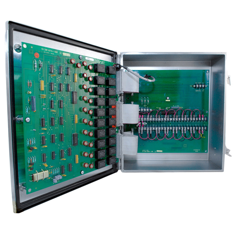 The Low Energy PIU MUX box is the remote field termination and multiplexing assembly used with the low energy PIU. It consists of a termination board and a multiplexer relay board mounted in a NEMA 4 enclosure. The mux cards can be selected for either thermocouple or RTD input. Up to 16 mux boxes of up to 16 points each can be daisy-chained to a single LE PIU common card file.